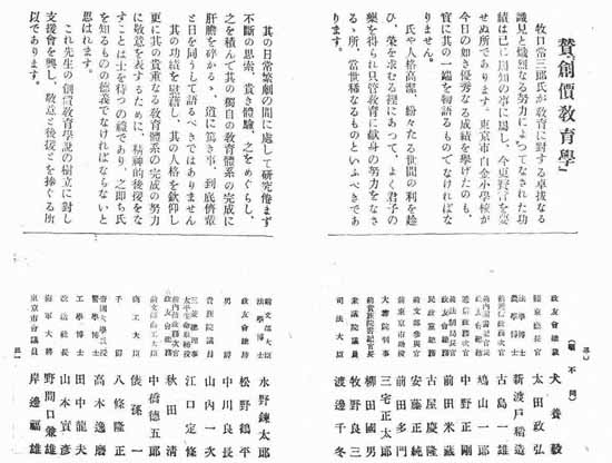 | Nov 20 | The educational magazine Kankyo (Environment) (publisher: Jogai Toda) carries a testimonial "In Support of Value-Creating Pedagogy" signed by 28 prominent individuals, including future prime minister Tsuyoshi Inukai (1855-1932). "In support of Value-Creating Pedagogy" signed by 28 prominent individuals. |